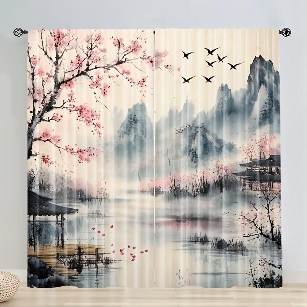 2PCS Asian Scenery Sheer Curtains Cherry Blossom Mountain Pagoda Rod Pocket for Living Room Bedroom Office (Rod Not Included)