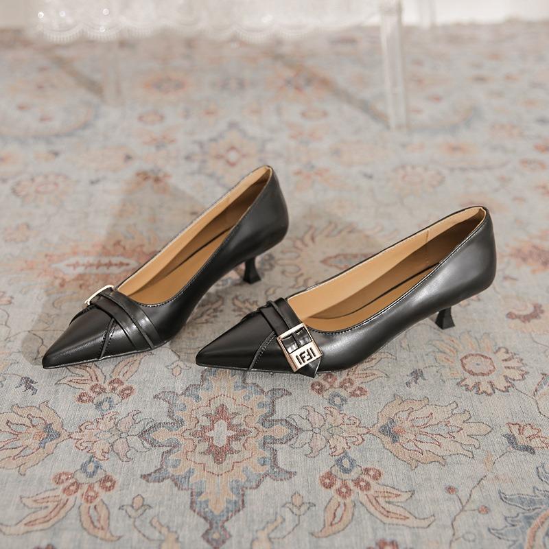 Retro small heel single shoes women's spring summer new belt buckle pointed head shallow mouth daily commuting high heels