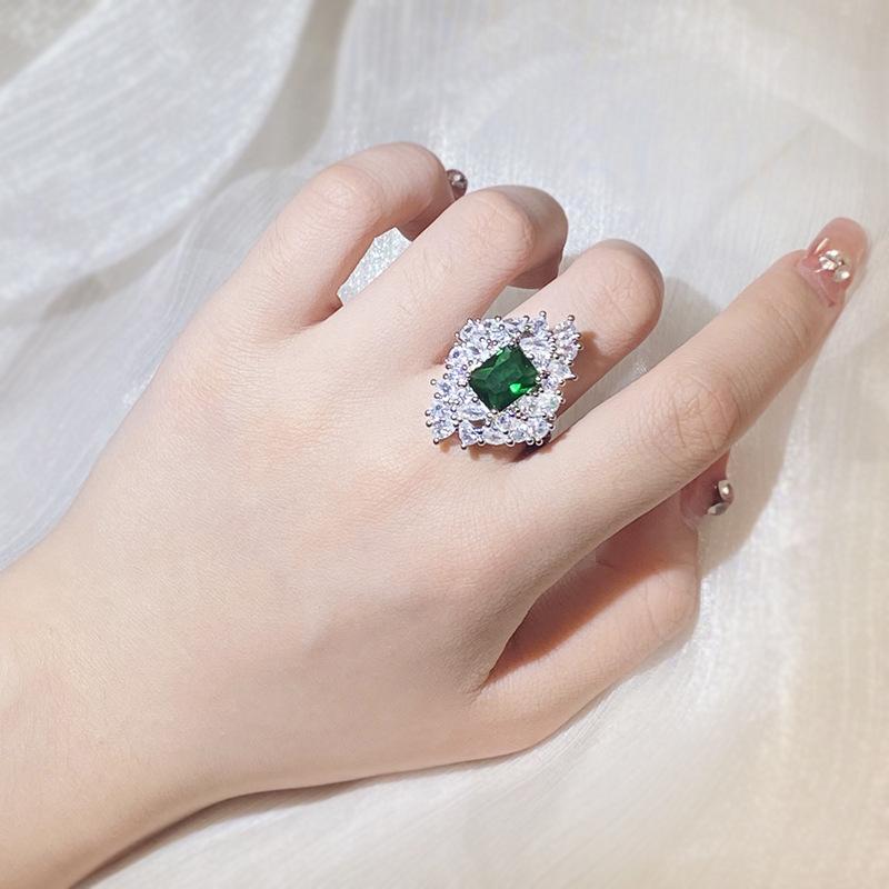 Luxury Full Diamond Princess Square Ring Emerald Simulation Open Ring Female Tourmaline Copper