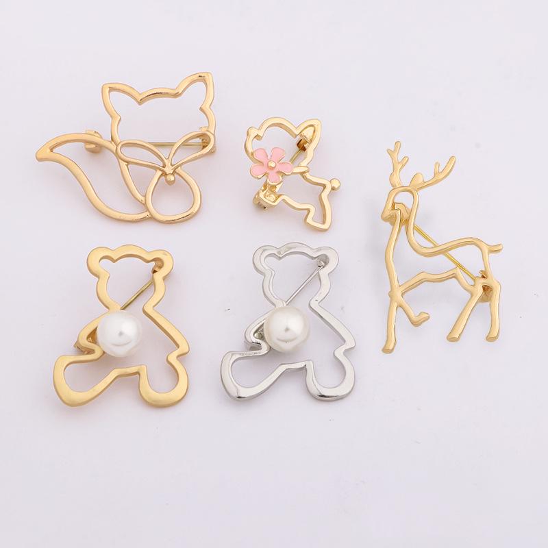 Golden Openwork Animal Brooch Pin - Fox, Deer, Cat, Pearl Teddy Bear Design Classic Fashion Accessory