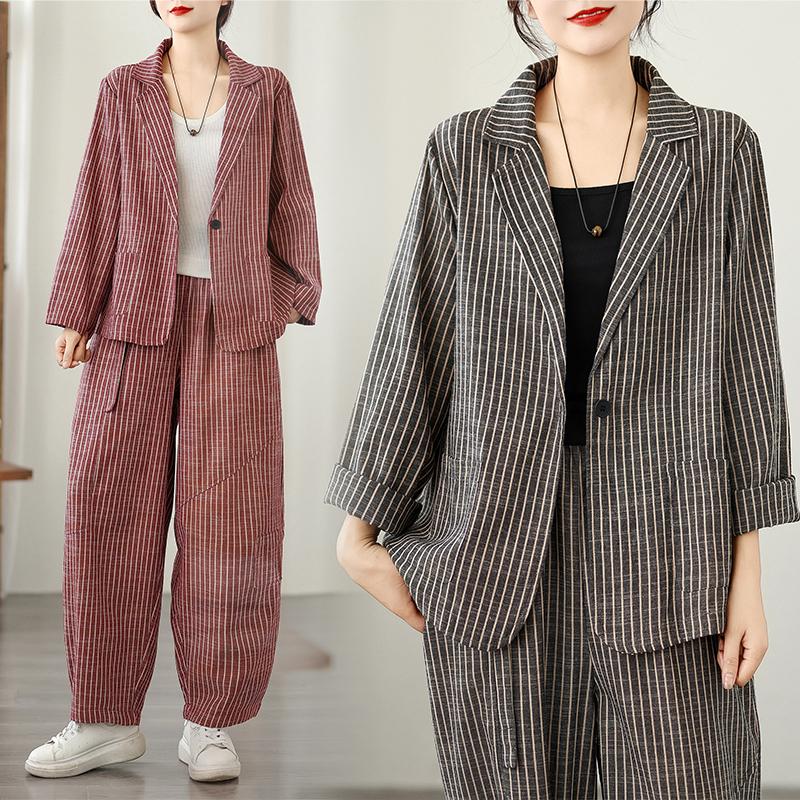 Striped Cotton and Linen Fashion Suit Female Spring and Fall Fashion Literary Leisure Suit Loose Haren Pants Two-piece Set