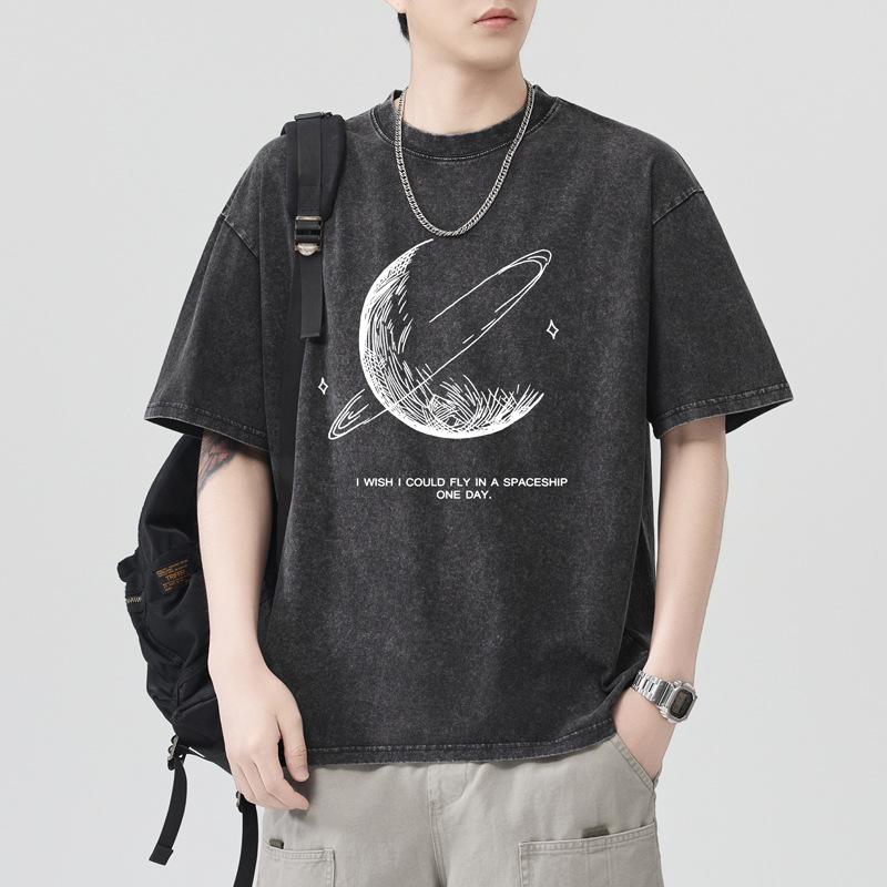 230g Ciężko Prana Wodą Smażona Płatek Śniegu Luźny Krój Bawełniany T-shirt Krótki Rękaw Cienki Drukowany Krótki T-shirt
