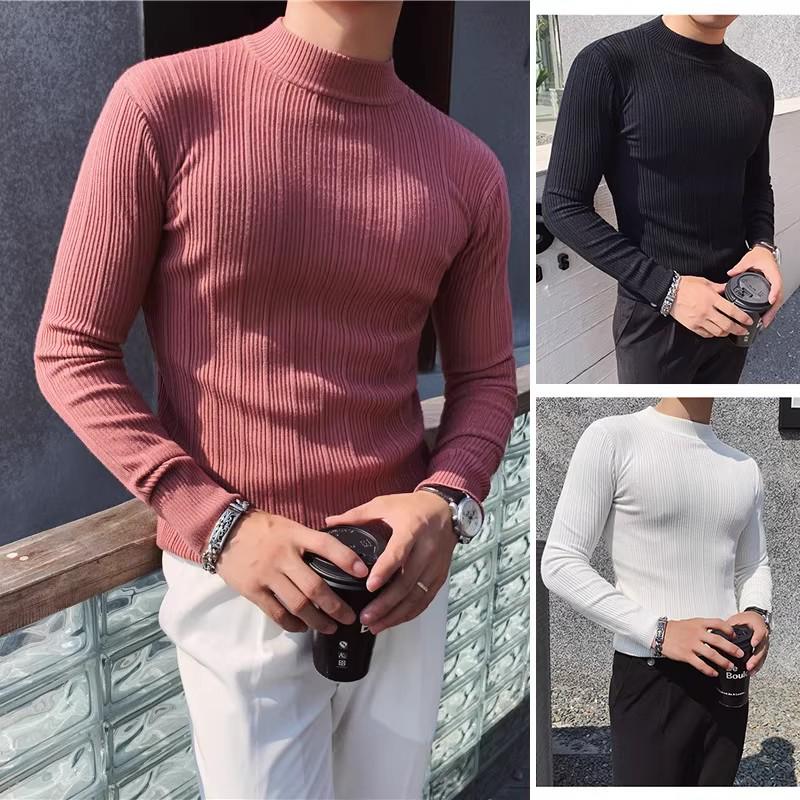 Men's High-Elasticity Ice Silk Ribbed Long Sleeve Striped T-Shirt