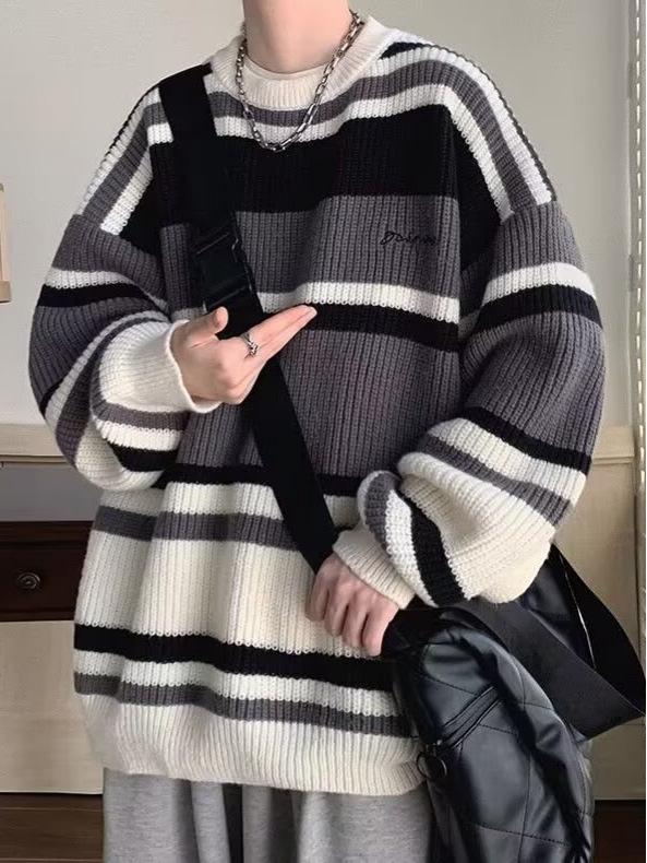 Men's Retro Japanese Striped Knitted Sweater Jacket - Autumn/Winter, Thick & Trendy