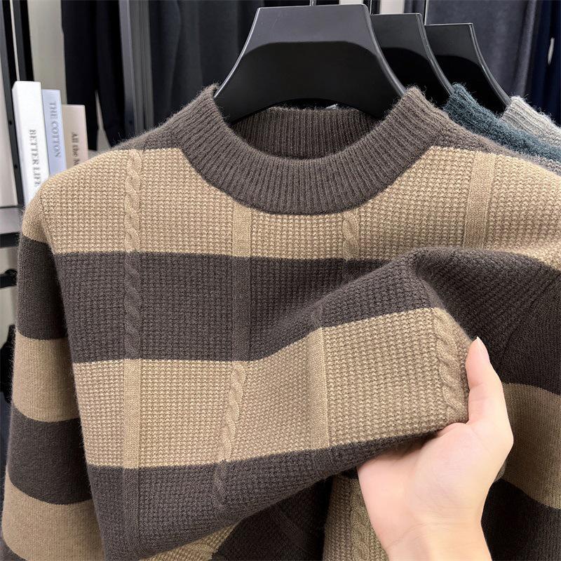This stylish winter sweater is designed for comfort and casual elegance. It features a loose fit and long sleeves, making it ideal for layering during colder months. The round neckline adds a classic touch, while the striped jacquard pattern introduces a modern flair. Crafted from a nylon material and a chemical fiber blended for fur, the sweater offers a standard thickness that is perfect for everyday wear. Whether you're relaxing at home or heading out for a casual meet-up, this sweater provides both warmth and style.