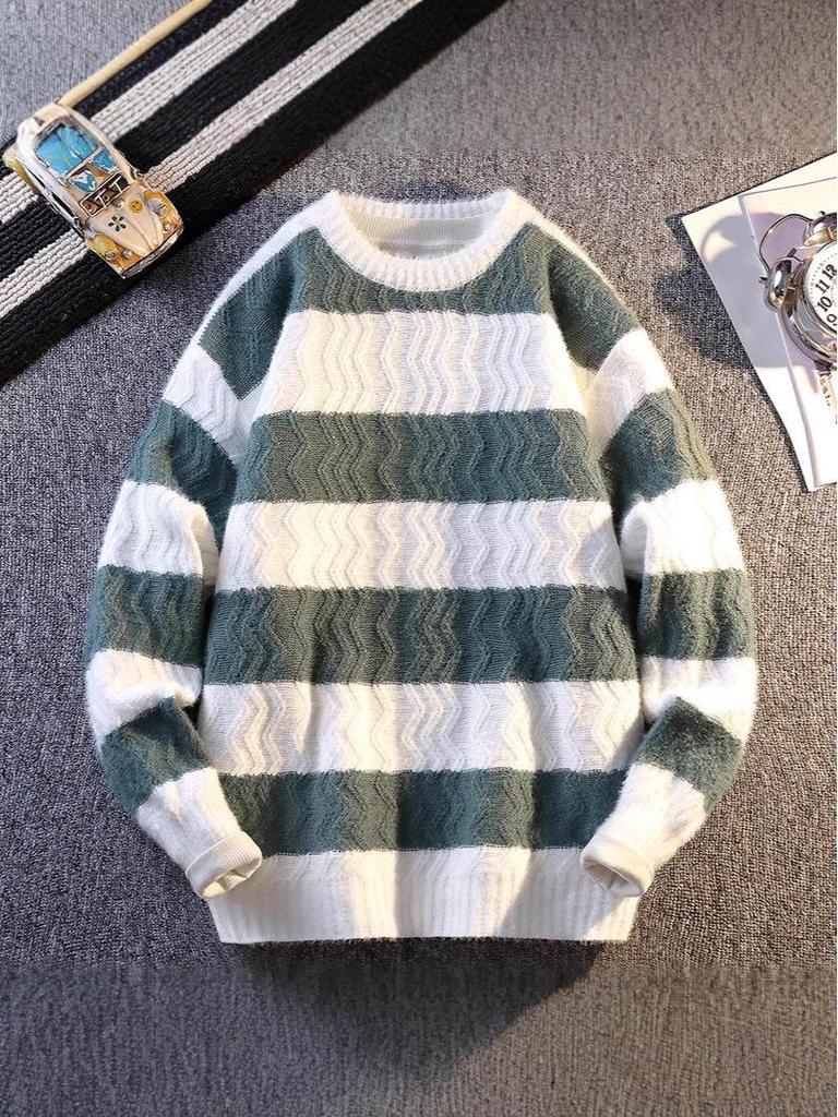 Korean Style Color Block Striped Pullover Sweater for Men - Warm, Loose Fit, Round Neck (2025 Autumn/Winter Collection)