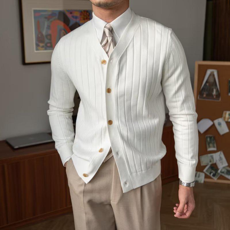 Poczuj idealne połączenie stylu i komfortu dzięki temu dopasowanemu męskiemu swetrowi rozpinanemu, zaprojektowanemu na sezon jesienno-zimowy.. Dzięki eleganckiemu dekoltowi w serek i długim rękawom, ten kardigan zapewnia wyrafinowany wygląd, który jest zarówno wszechstronny, jak i modny.. Wykonany z wysokiej jakości mieszanki bawełny, zapewnia lekkość i przytulność, idealny do warstwowego ubierania.. Cienka konstrukcja zapewnia nowoczesną sylwetkę bez kompromisu w kwestii ciepła, czyniąc ją podstawowym elementem każdej garderoby.
