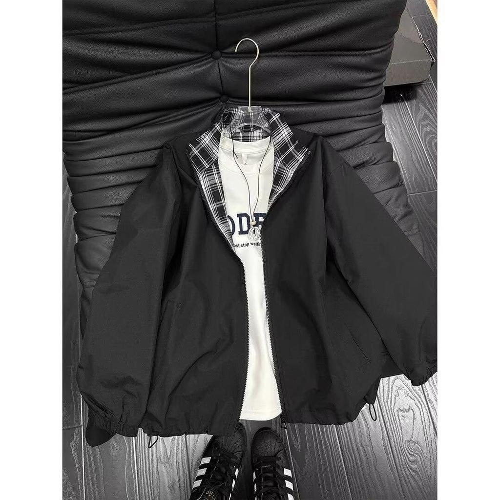 Men's Color-Block Plaid Stand-Up Collar Sports Jacket - Spring/Autumn Loose Casual Windproof Outerwear, Hong Kong Style.