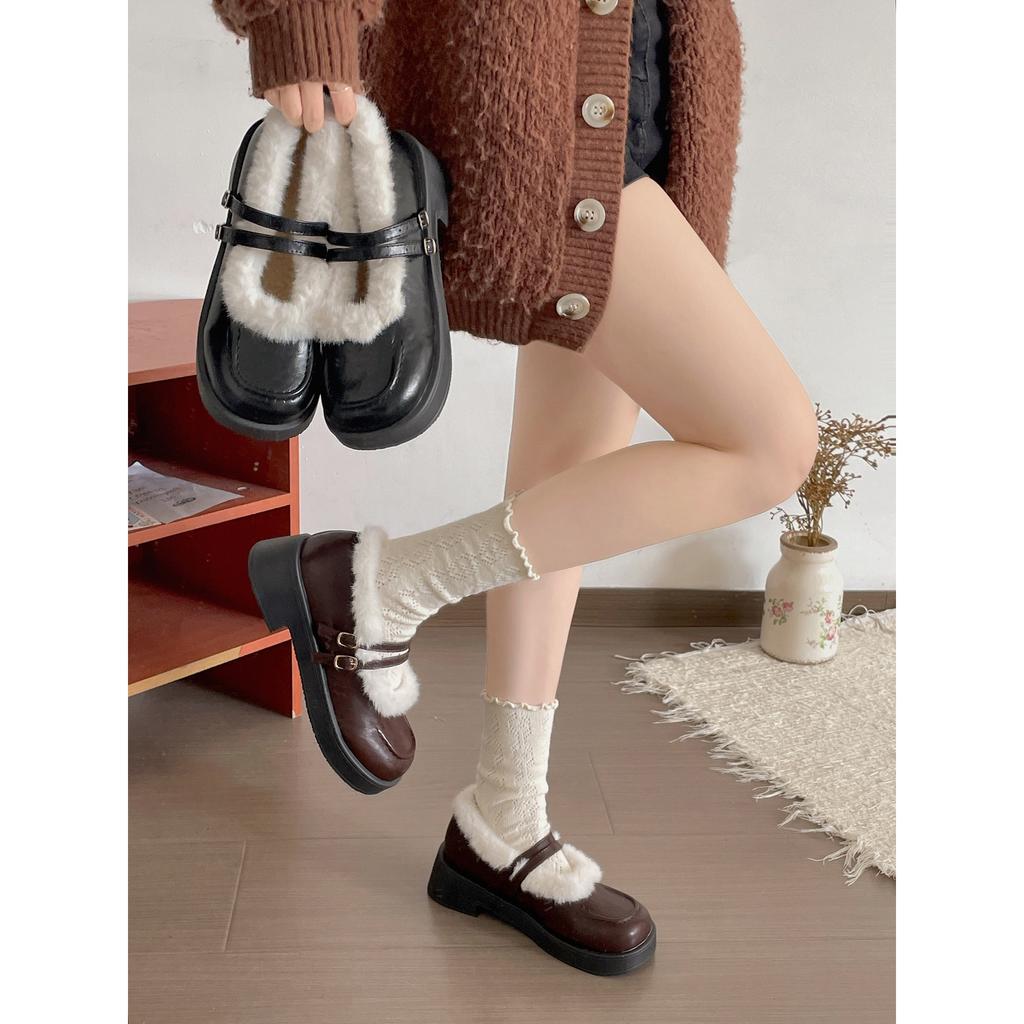 Retro thickened warm thick-soled fluffy shoes women's winter heightening and velvet Mary Jane small leather shoes