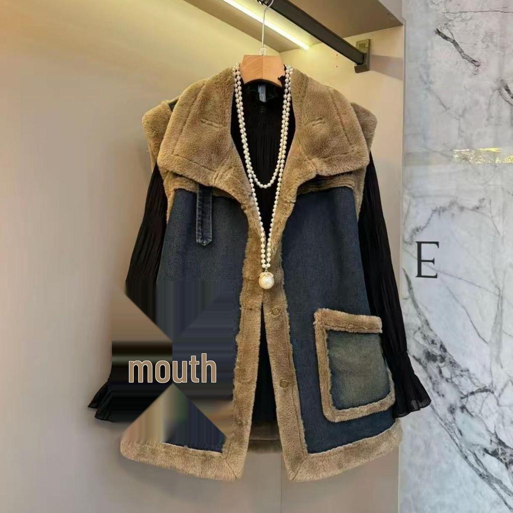 Przytulna Szykowna Kamizelka Patchworkowa Jeansowa z Podszewką z Polarowego Materiału Duży Rozmiar Modelująca Sylwetkę