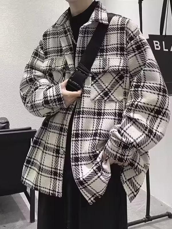 Wyrafinowana męska kurtka robocza z wełny w pepitkę - Modna koreańska odzież codzienna