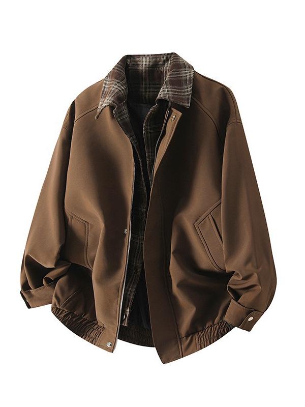 Introducing a stylish and versatile addition to your wardrobe designed for the modern gentleman. This unique jacket features a classic plaid patchwork pattern, exuding a sense of timeless sophistication. Made from high-quality polyester, it offers medium outerwear thickness, perfect for layering during the transitional seasons of spring and autumn. The jacket's distinctive flight collar, tailored neckline, and long sleeves provide a comfortable yet refined fit. Ideal for those seeking a blend of American and British styles, this jacket is an excellent choice for elevating casual or semi-formal ensembles.