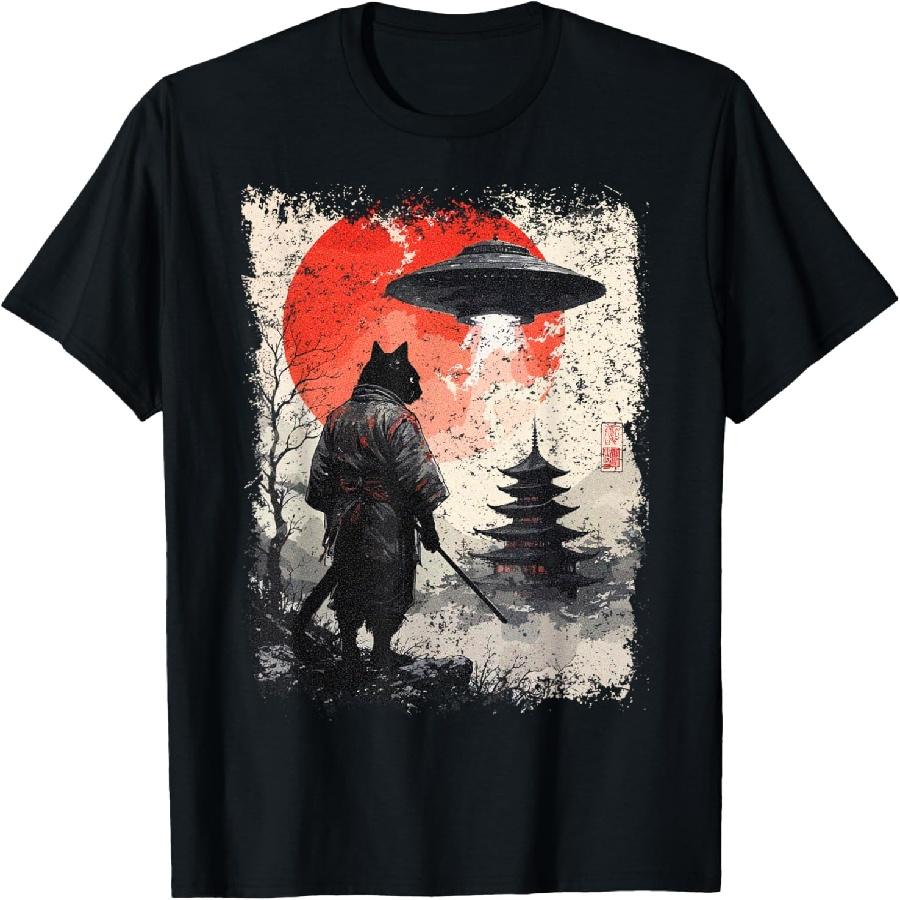 Samurai Ninja Cat Warrior Sumi-e UFO Ukiyo-e Sci Fi Japanese T-Shirt