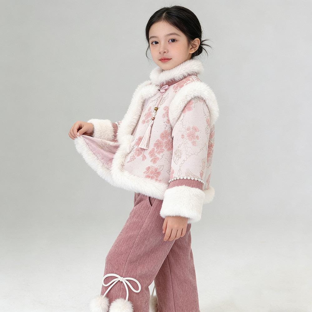 Ten zimowy zestaw dla dziewczynek łączy tradycyjną chińską elegancję z przytulnym komfortem. Dwuczęściowy zestaw zawiera aksamitny top i pasujące spodnie, oba ozdobione luksusowym futrzanym obszyciem. Zaprojektowany z długimi rękawami, strój zapewnia ciepło w chłodne dni. Wykonany z mieszanki bawełny i poliestru, zapewnia miękkość w dotyku i trwałość, dzięki czemu jest idealny zarówno na specjalne okazje, jak i do noszenia na co dzień.