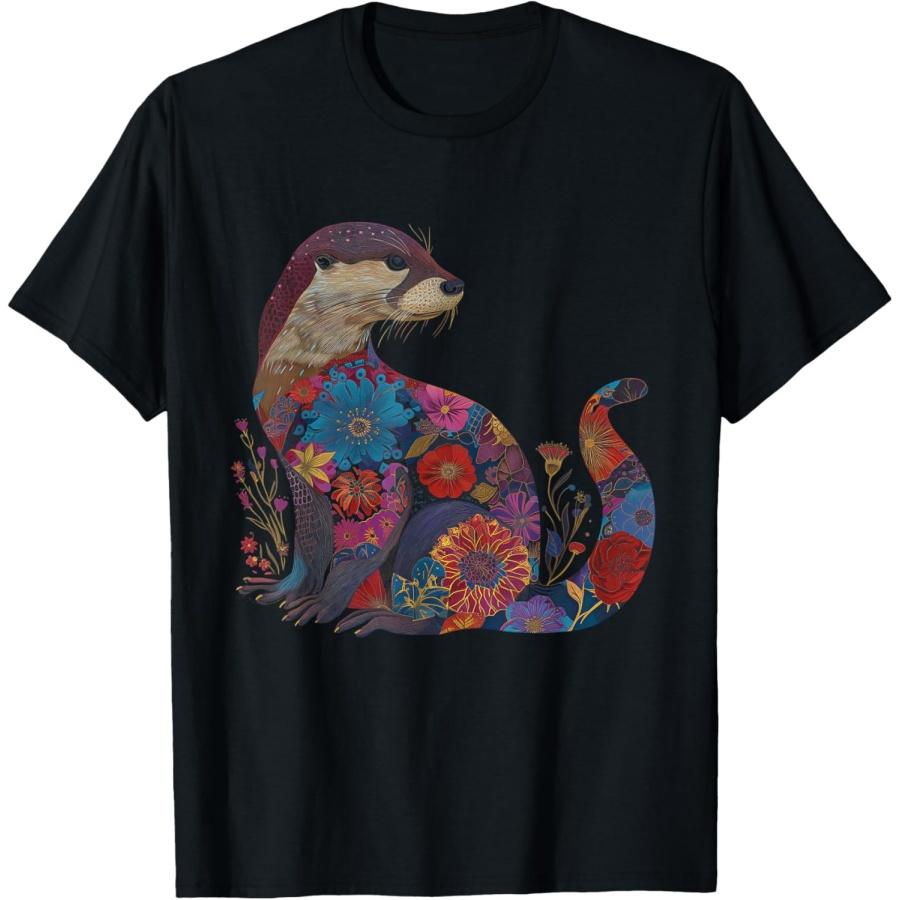 Otter Floral Artwork Vintage Flowers Cute Sea Otter T-Shirt