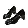 Thick Heel Medium Heel Single Shoes Women's Rhinestone Bow Versatile Satin One-word Buckle Strap Square Head Mary Jane Shoes