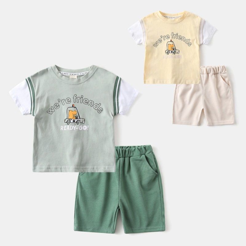 Boy Summer Short-Sleeved Top Suit Baby Cartoon Hippo Car Two-piece Set Kids Pure Color Shorts Clothes