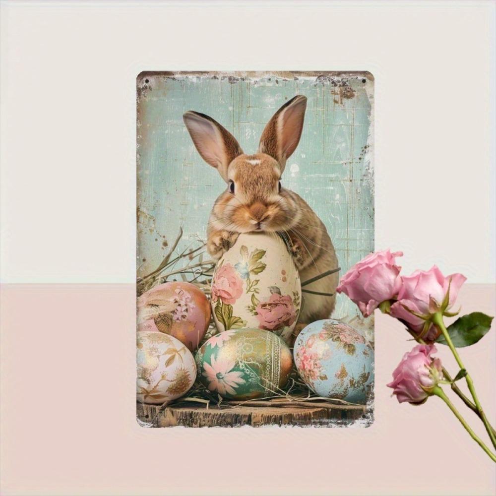 Vintage Easter Bunny Floral Eggs Metal Tin Sign Rustic Wall Art Home Decor