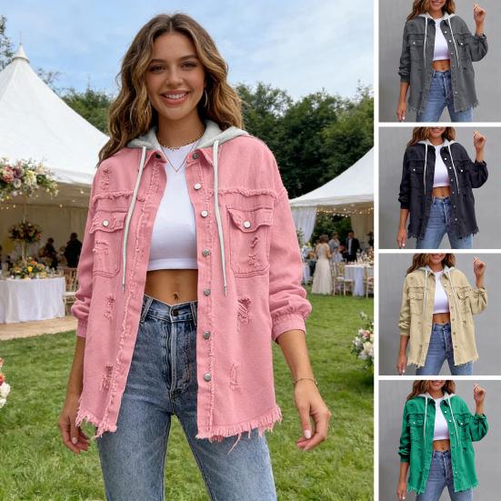 Ta damska kurtka dżinsowa łączy komfort i styl, wykonana z miękkiego, oddychającego denimu, idealna na wiosnę i jesień.. Dzięki długości do połowy uda, z kapturem i kieszeniami na piersi, oferuje praktyczne miejsce do przechowywania, jednocześnie podkreślając Twój swobodny wygląd..
