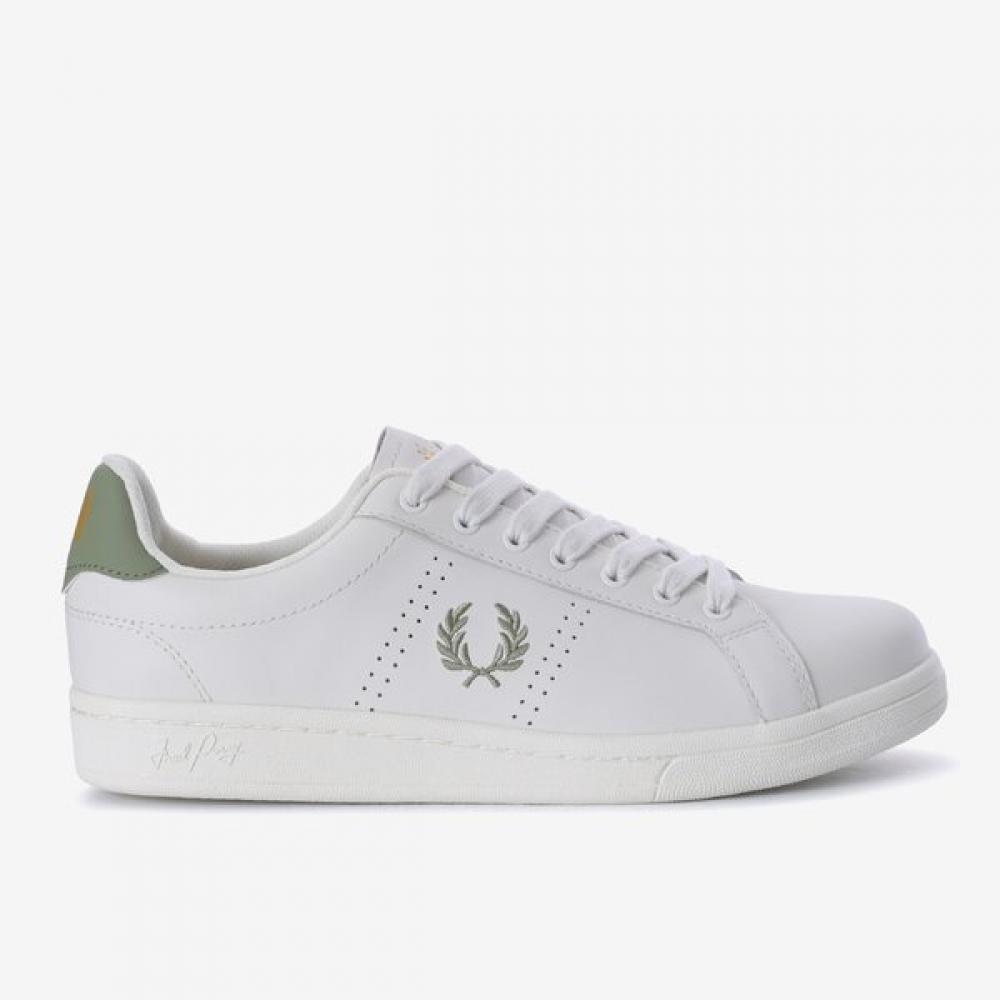 The Fred Perry B721 Leather Sneakers in white is a sneaker that bridges casual and sports styles. Made from high-quality genuine leather, this sneaker is durable and features a synthetic rubber sole for slip resistance and cushioning. The versatile white color complements various outfits, making it suitable for everyday wear.