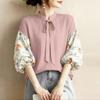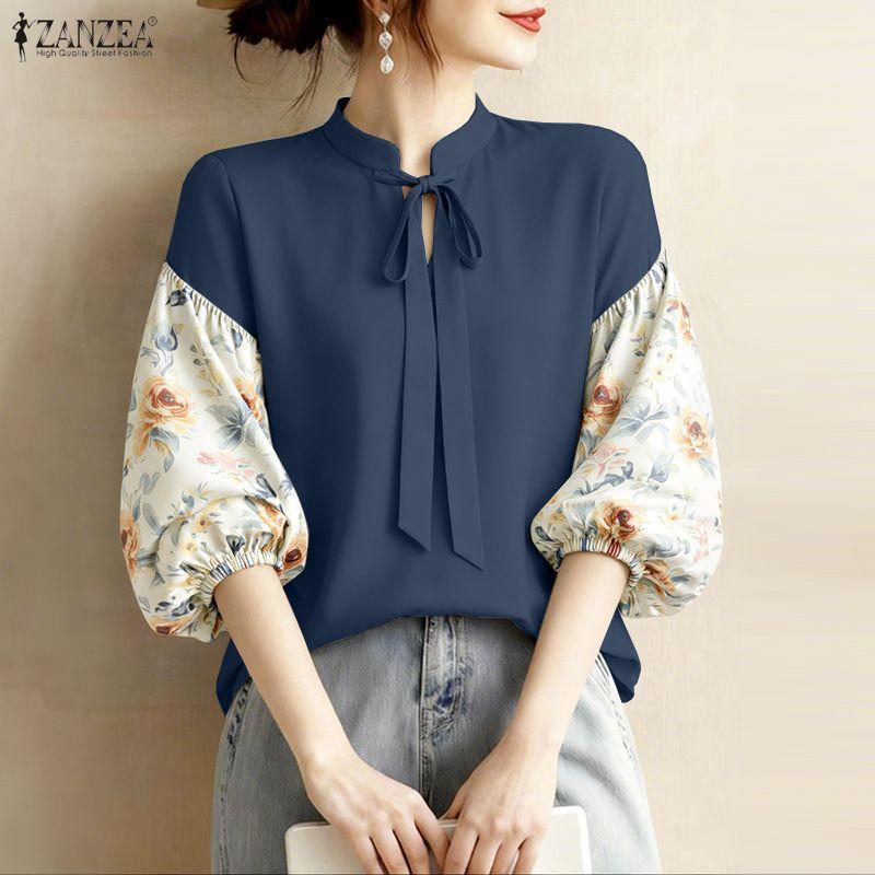 ZANZEA Women Casual V-Neck Floral Print Splice 3/4 Sleeve Blouse