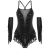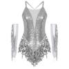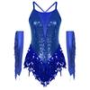Damski Kostium na Występ Tańca Łacińskiego z Krzyżowym Tyłem Błyszczące Płatki Frędzle Body Metaliczne Rękawiczki