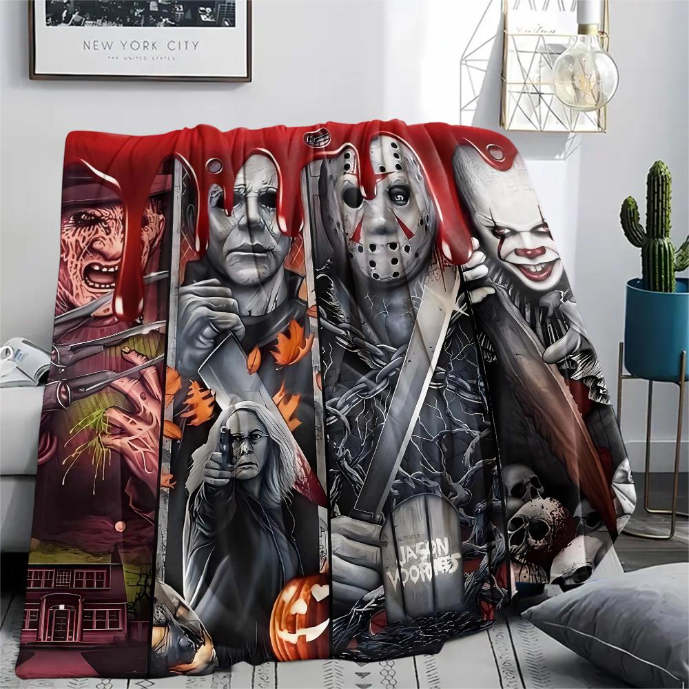 1 szt. Koc flanelowy z nadrukiem z filmu grozy, Wysokiej jakości, Wygodny na wszystkie pory roku, Wystrój domu, Ciepło i komfort, Idealny na prezenty świąteczne