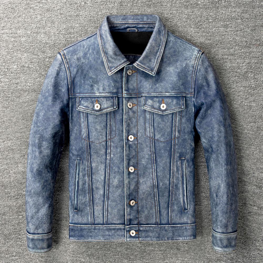 Vintage Blue Genuine Cow Men Leather Jacket 507 Style Slim Fit Coat Men's Leather Jackets Male Clothes Spring Autumn