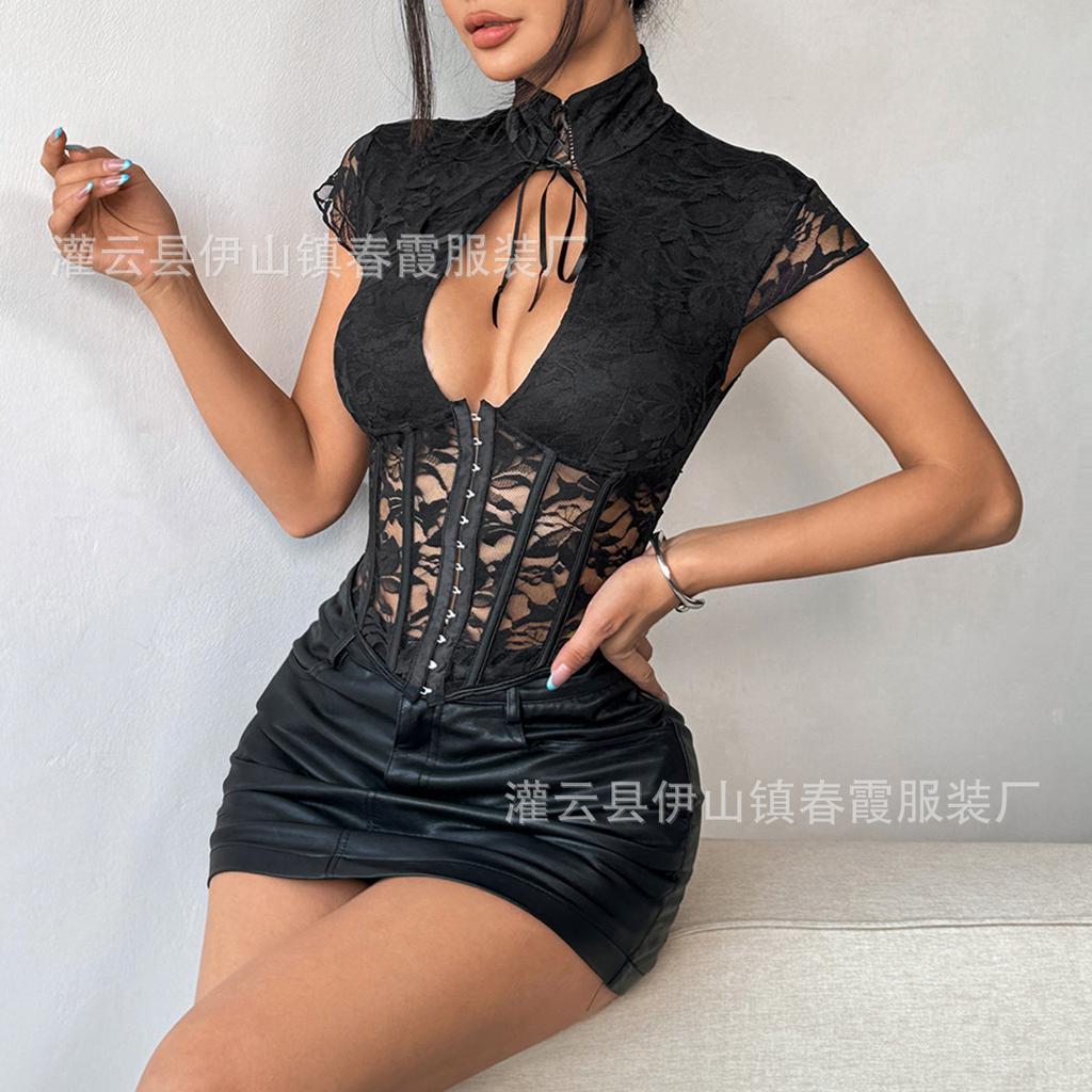 Slim-fit street lace semi-transparent hollow sexy lace-up fishbone breasted turtleneck three-sleeved top women