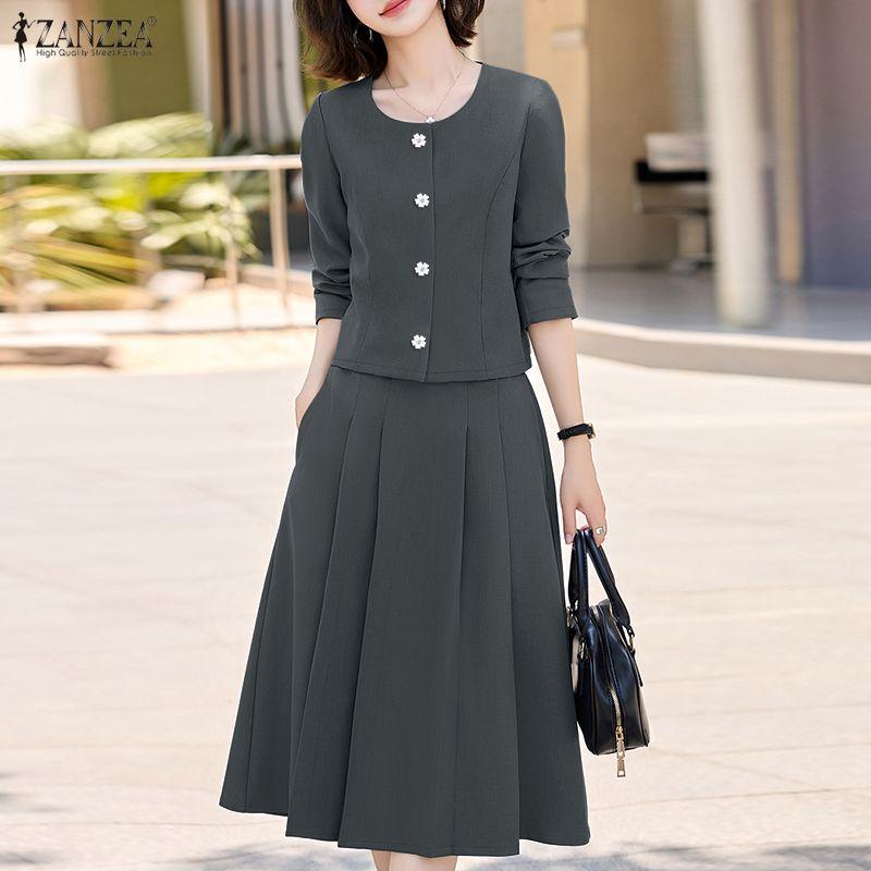 ZANZEA Damska Bluzka z Długim Rękawem i Spódnice Casualowe Zestawy Dwuczęściowe