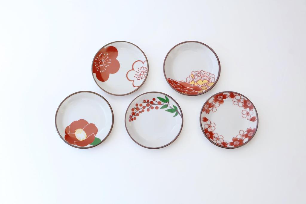 Saikai Pottery (Saikaitoki) Small Plate Set, Japanese Tableware, Hasami Ware, Red-Painted Flower Pattern Small Plates (Set of 5)
