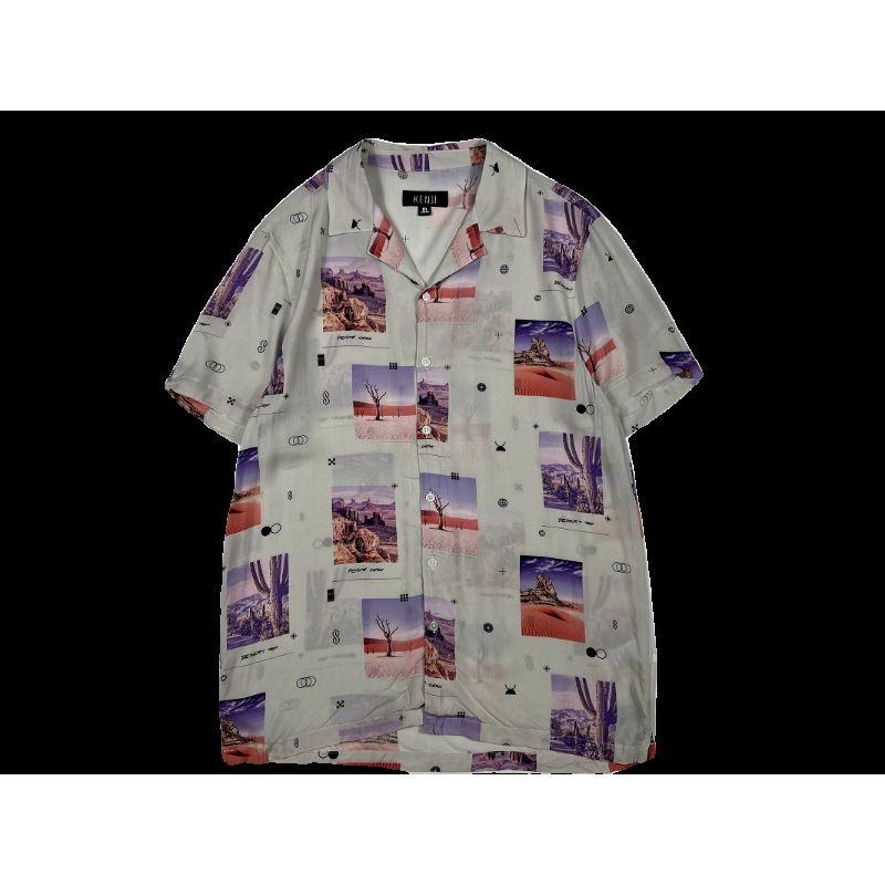 European and American Single Men Summer Rayon Shirt American Casual Loose Thin Cuban Collar Vintage Print Short Sleeves Shirt
