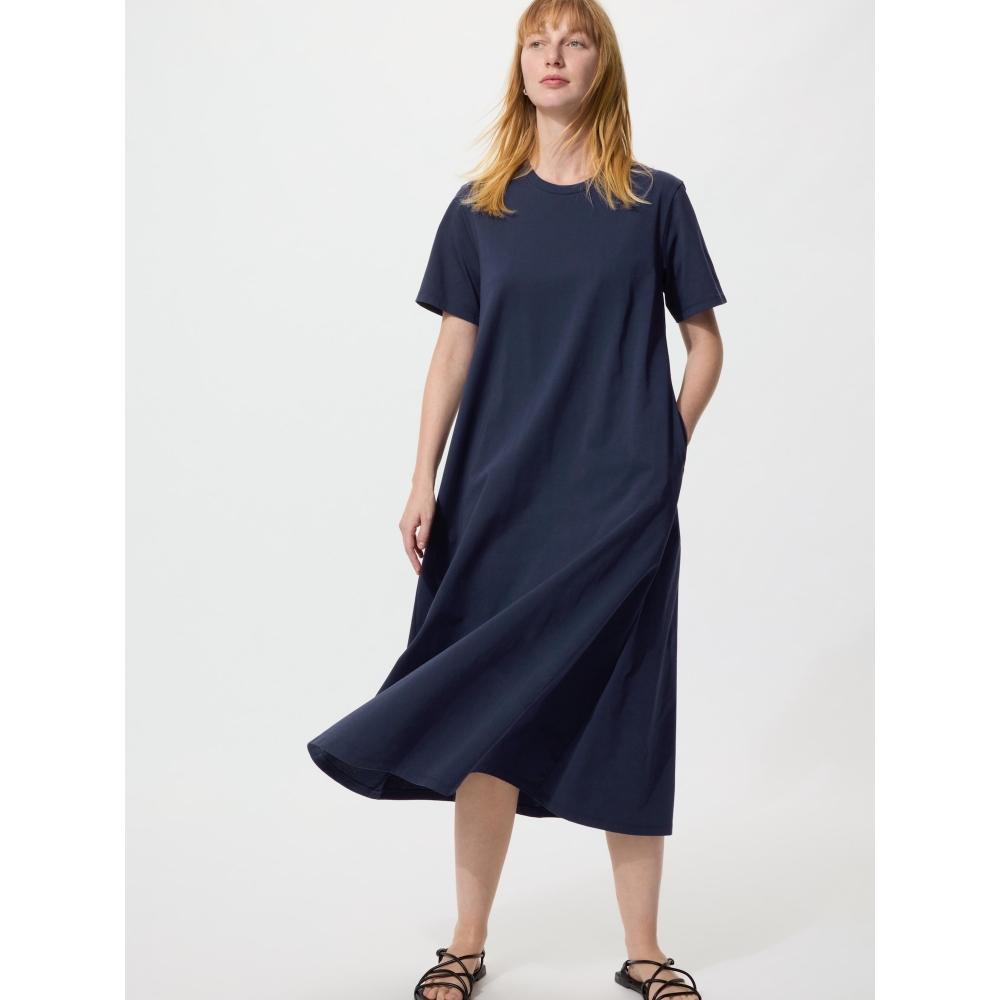 The UNIQLO AIRism Cotton T Dress (Short Sleeve) is crafted from luxurious textured fabric, making it easy to style from casual to modern looks. It features an elegant A-line silhouette in a long design, complemented by practical side pockets for added convenience. There is no transparency (except for 31 BEIGE), and it offers a regular fit for comfortable wear.