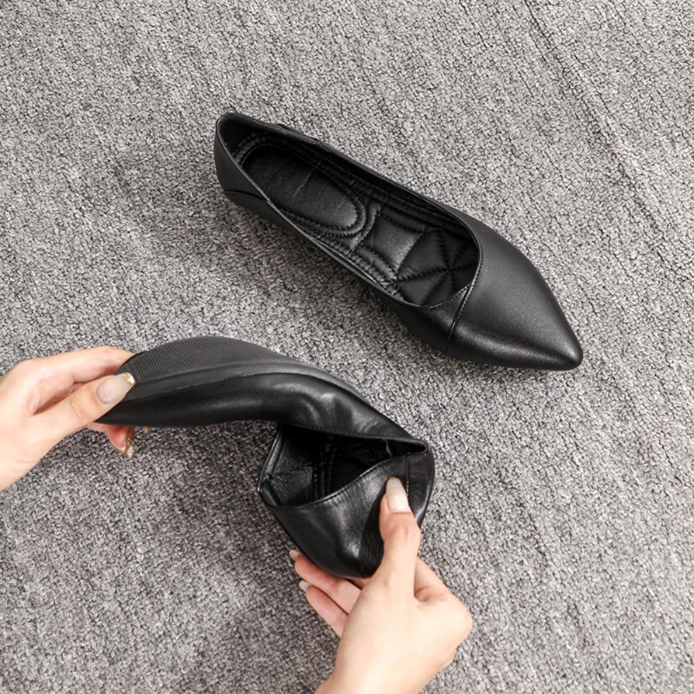 Women's Black Pointed-Toe Work Shoes - Soft Leather Shallow Mouth, Flat Soft-Soled, Comfortable for Interview/Flight Attendant, XCY36-357