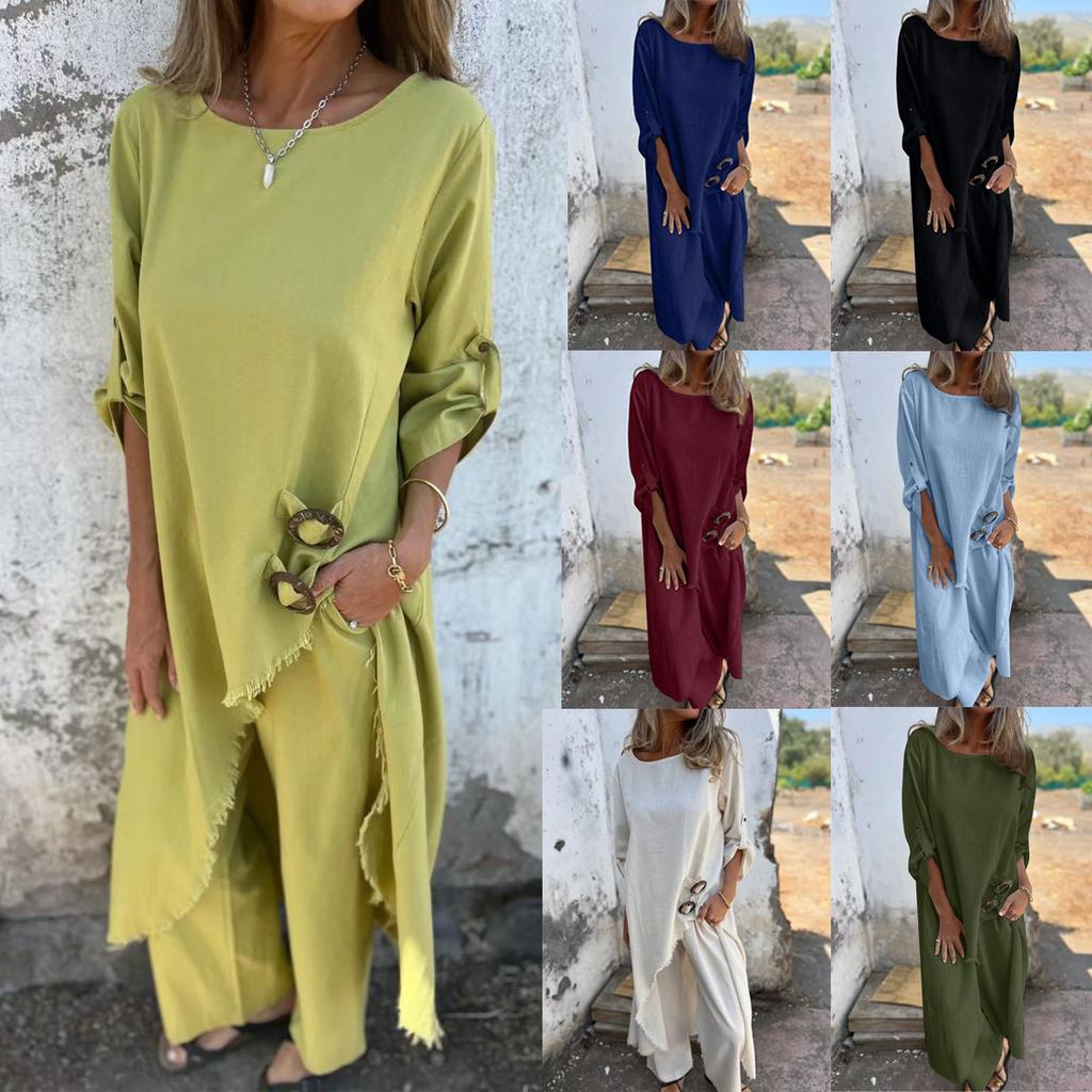 Przedstawiamy 2-częściowy damski zestaw koszulowo-spodniowy, wszechstronny i stylowy zestaw, który bez wysiłku łączy profesjonalizm z kobiecym urokiem. Ten swobodny dwuczęściowy komplet wykonany z luksusowej mieszanki bawełny i lnu oferuje niezrównany komfort i styl.