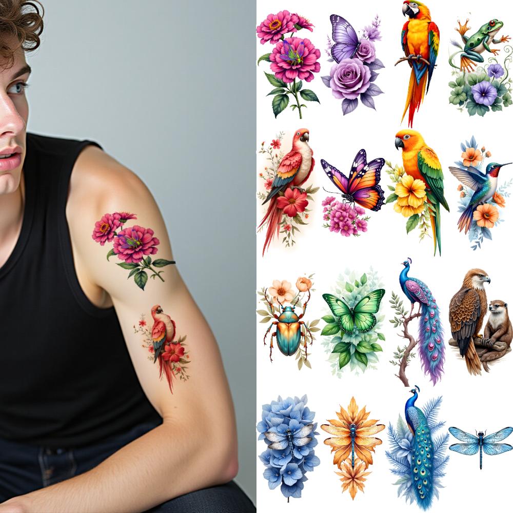9pcs Temporary Tattoo Flower Tattoo Colorful Frog Tattoo Butterfly Tattoo For Male Arms Back