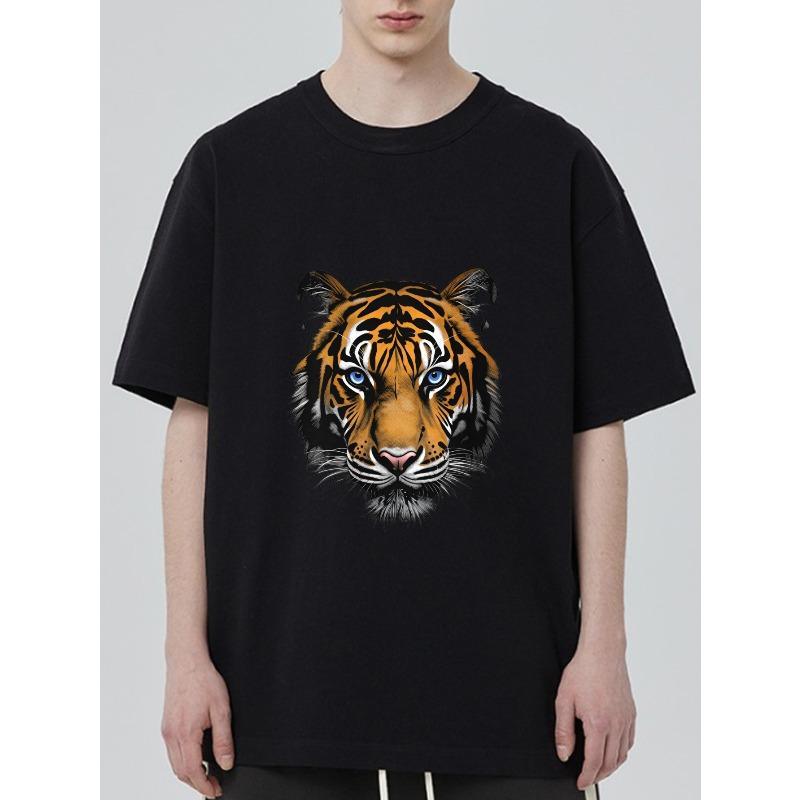 Black Tiger Face Print T Shirt For Men Casual Wear Street Style Fashion Top Tee With Bold Animal Design Perfect For Daily Outings