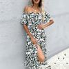 New summer waist slim fit medium and long dress short sleeve printed one-word shoulder dress