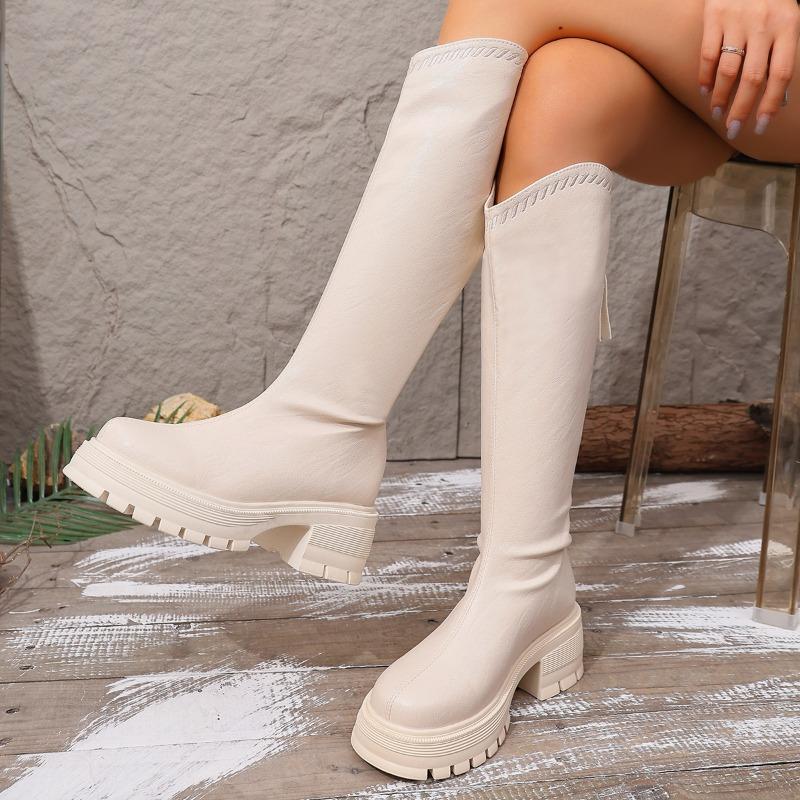 High Stretch Boots Fashion Round Toe Zipper Platform Anti-Slip Wear-Resistant Block Heel Skinny Boots