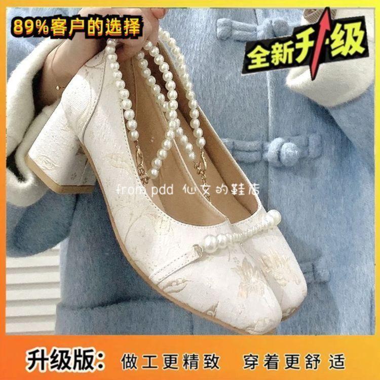 Embroidered shoes Mary Jane shoes spring dance French small fragrant style evening thick heel single shoes temperament high heels evening style
