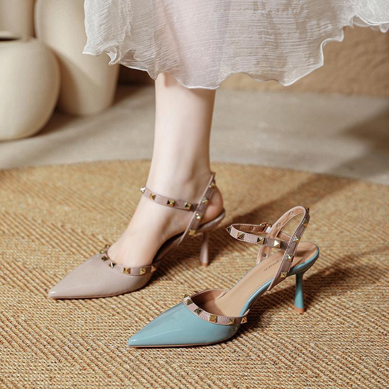 Rivets one-word with high heels, thin heels, summer bag head sandals, large size pointed rear empty single shoes