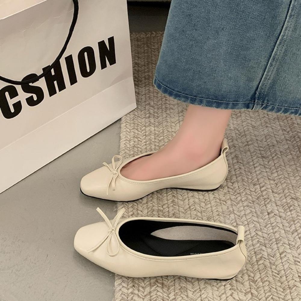 Women Leather Flat Shoes Fashionable Round Toe Casual Ballerina Bow Ballet Shoes Soft Moccasin Black with Beige Lolita Shoes