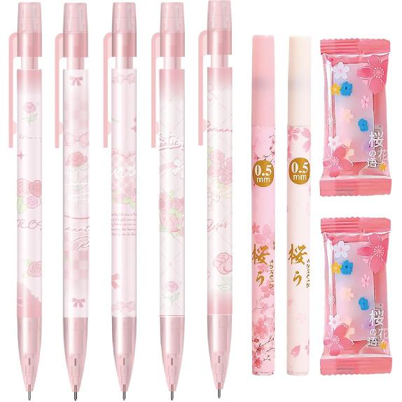 Cute Pink Mechanical Pencils with Refills and Erasers, 0.5mm Cute Mechanical Pencil Kawaii Flower Pencils for Students Women Girls Pencil Office