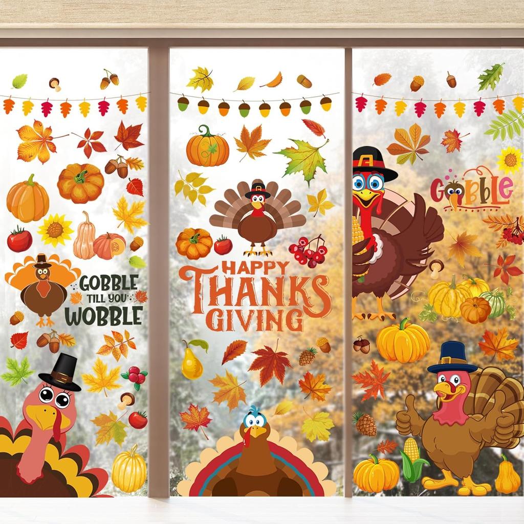 143 Pcs Thanksgiving Window Clings for Glass Windows Fall Window Stickers Seasonal Turkey Pumpkin Maple Leaf Decals Decorations for Thanksgiving