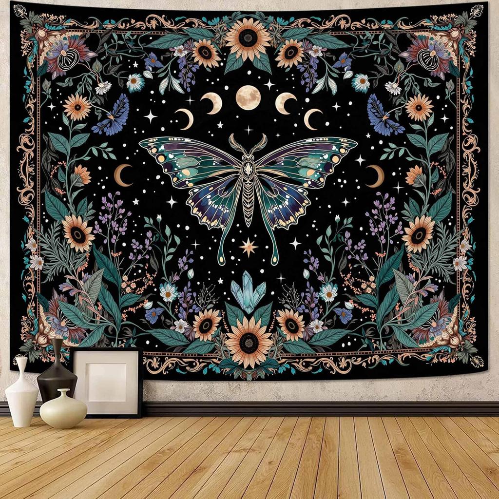 Faxdong Boho Green Butterfly Tapestry, Aesthetic Triple Moon and Sunflowers Crystal Tapestries, Moth Mystic Decor for Bedroom Living Room