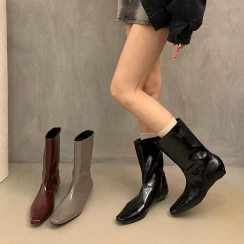 Designer Square Toe Women Slimming Knight Boots Elegant Female Slip On Wedges Low Heel Mid Calf Booties Zapatos De Mujer