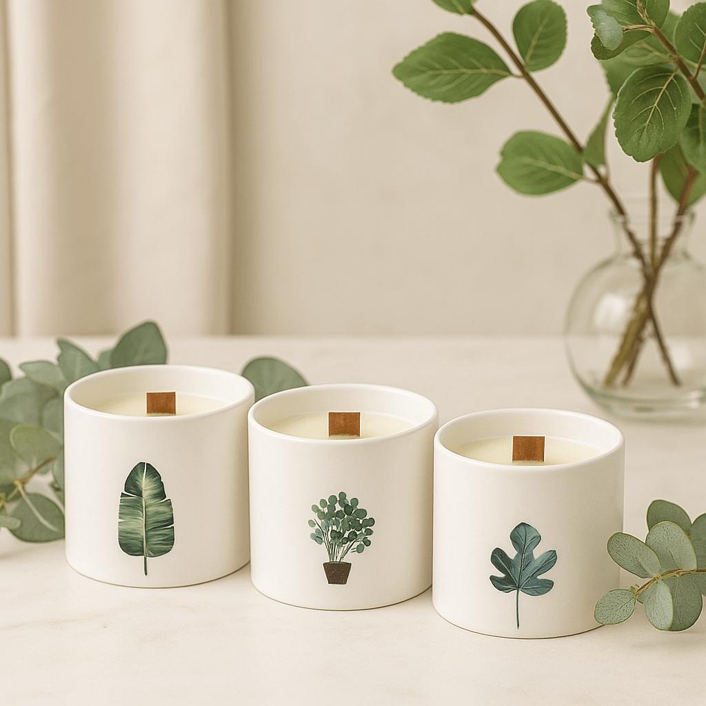 A soft wooden wick catches with a quiet crackle, and the light cream soy wax begins to glow. In its simple white vessel marked with a single green sprig, flame and fragrance meet — bringing a warm, botanical hush to the room. 🕯️