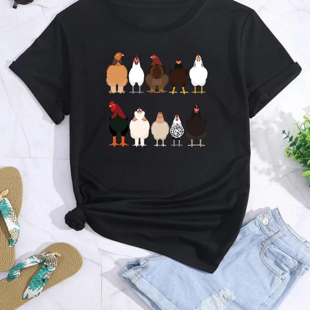 T-shirt z nadrukiem kurczaka, z okrągłym dekoltem, casualowy, luźny, z krótkim rękawem, modny, letni, topy, odzież damska, koszulki z grafiką, top Y2K