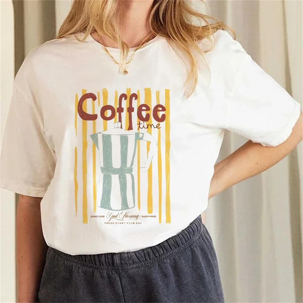 2025 Harajuku Women's Printed Coffee Pattern T-Shirt Summer New Basic Round Neck Short Sleeve Regular Fashion Style T-Shirt