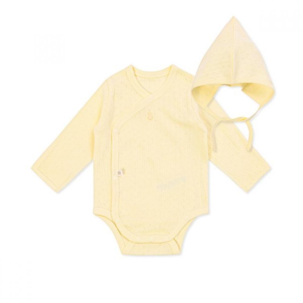 Żółty kombinezon dla niemowląt Organic Mom został zaprojektowany dla noworodków z użyciem miękkich materiałów, dzięki czemu nadaje się jako bielizna dla wrażliwej skóry.. Jego otwarta konstrukcja w okolicy brzucha ułatwia noszenie, a dołączony kapelusz zapewnia stylizację i ochronę głowy.